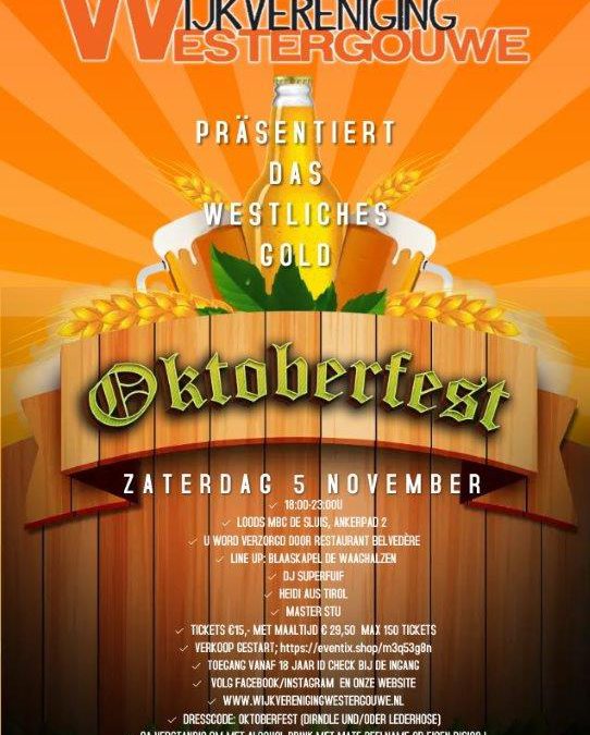 Wijkvereniging Westergouwe organiseert op 5 november een Oktoberfest met diverse artiesten, eten en drinken. Burgemeester Verhoeve komt het eerste vat aanslaan. Het Oktoberfest begint om 18:00 uur en is om 23:00 uur afgelopen.